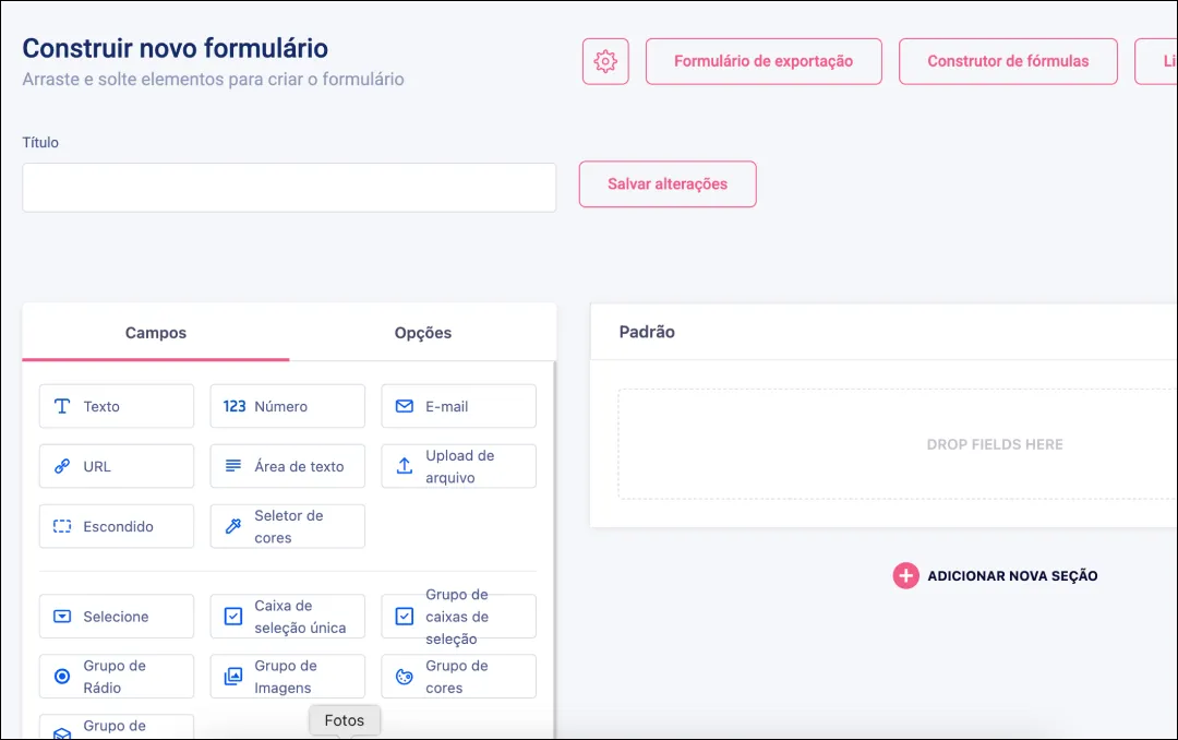 Campos personalizados diversos: Adicione campos como texto, área de descrição, menus suspensos, múltipla escolha, caixas de seleção, botões de rádio, upload de arquivos, datas, cores e mais.